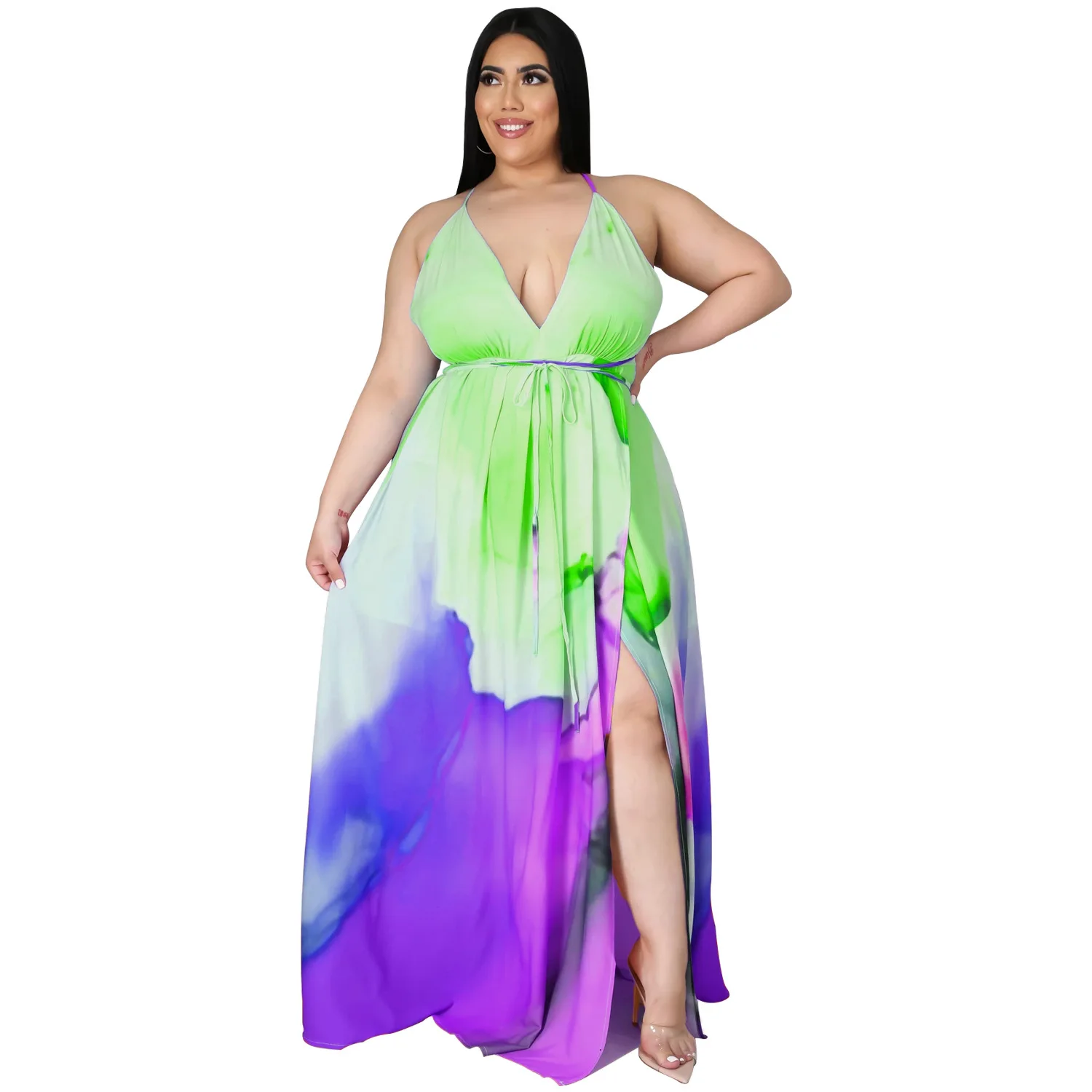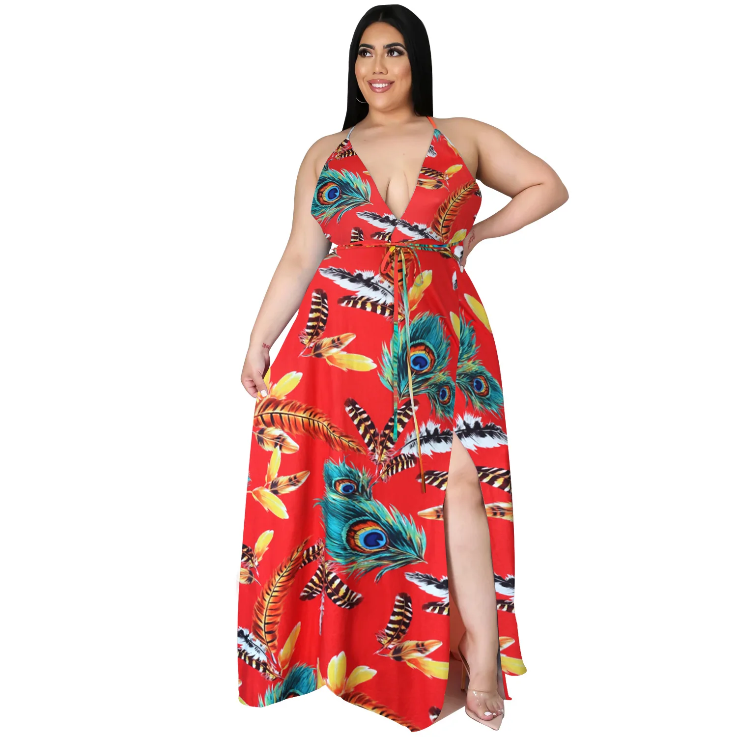 European American Women's Casual Bohemian Floral Dress Cross-Border Fashion Deep V Backless Slit Chiffon Lace Plus Front Natural